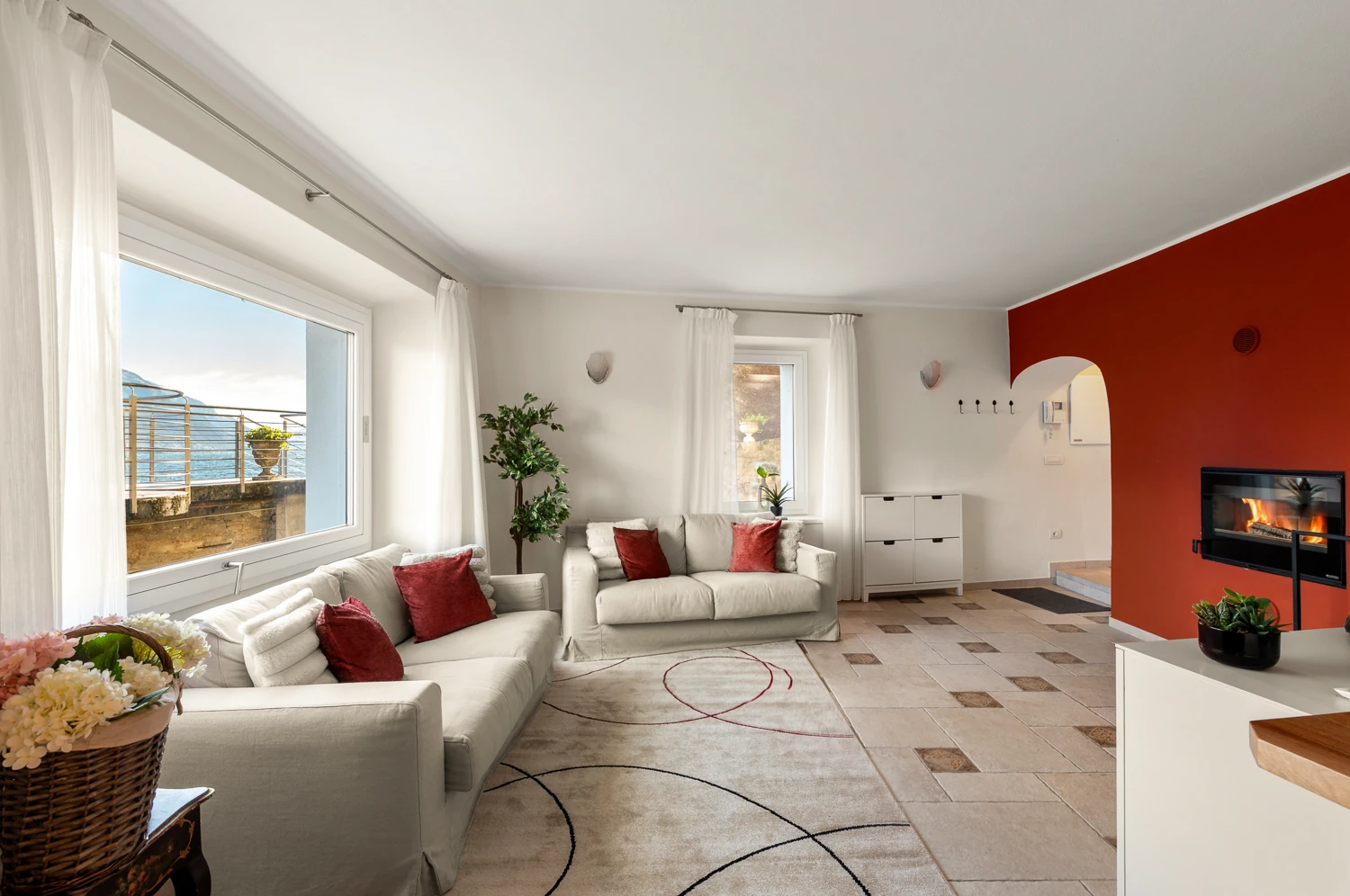 The ground floor offers a bright living room with fireplace, Smart TV, and a comfortable sofa bed for two guests. A fully equipped modern kitchen and a striking dining area framed by arched windows provide spectacular lake views. Doors open onto a private patio terrace with outdoor dining, barbecue, and relaxing seating areas.